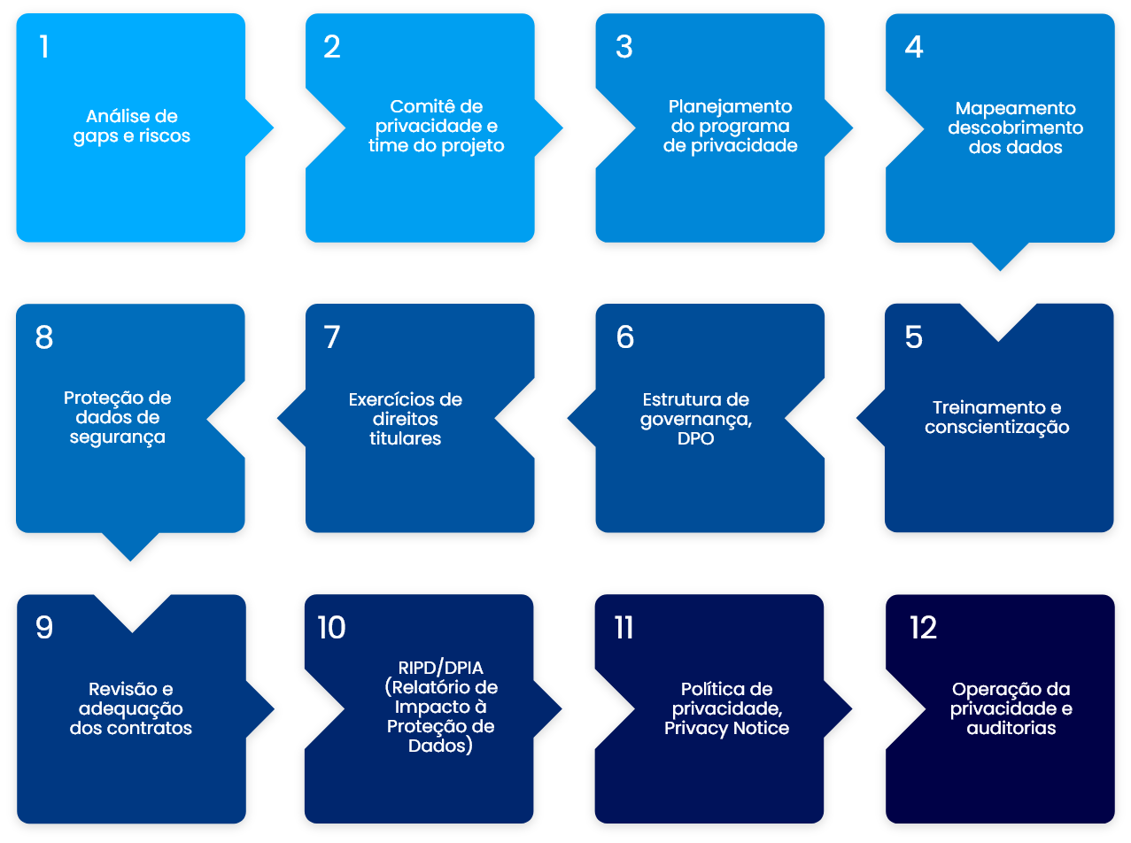 Ajudamos as empresas na estruturação da LGPD, incluindo o Programa Estratégico de Privacidade e os controles necessários nas áreas de de Governança, Jurídico, Segurança e Tecnologia.